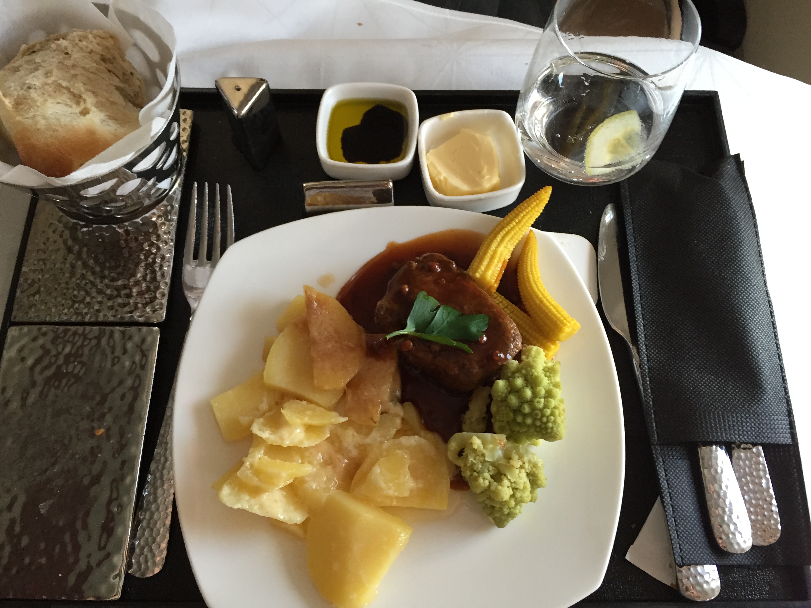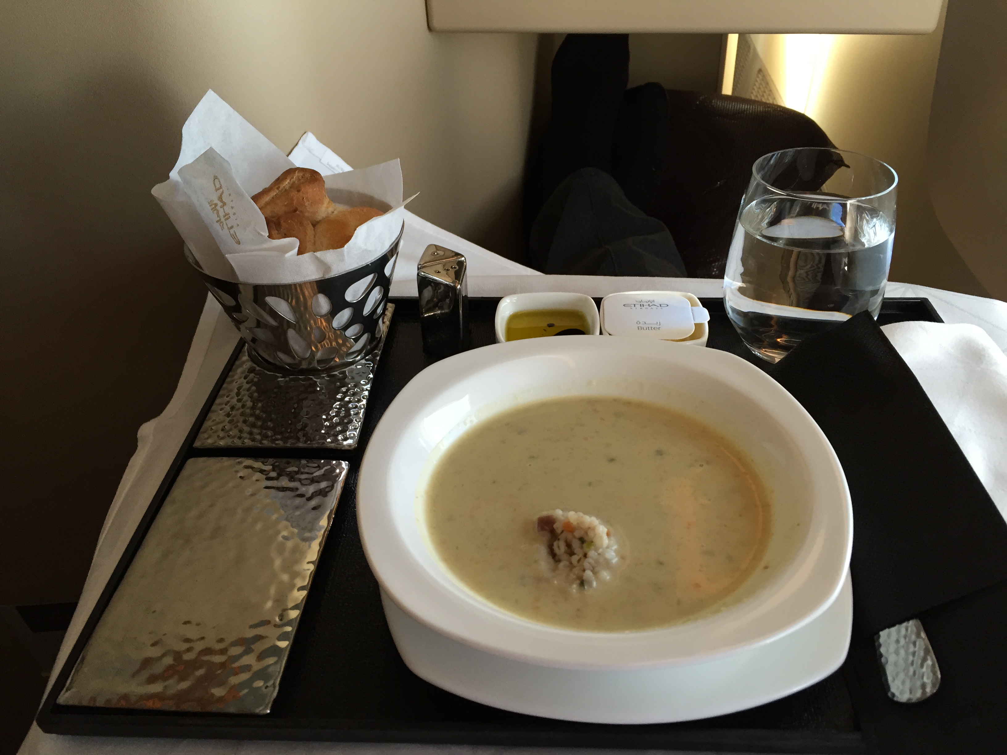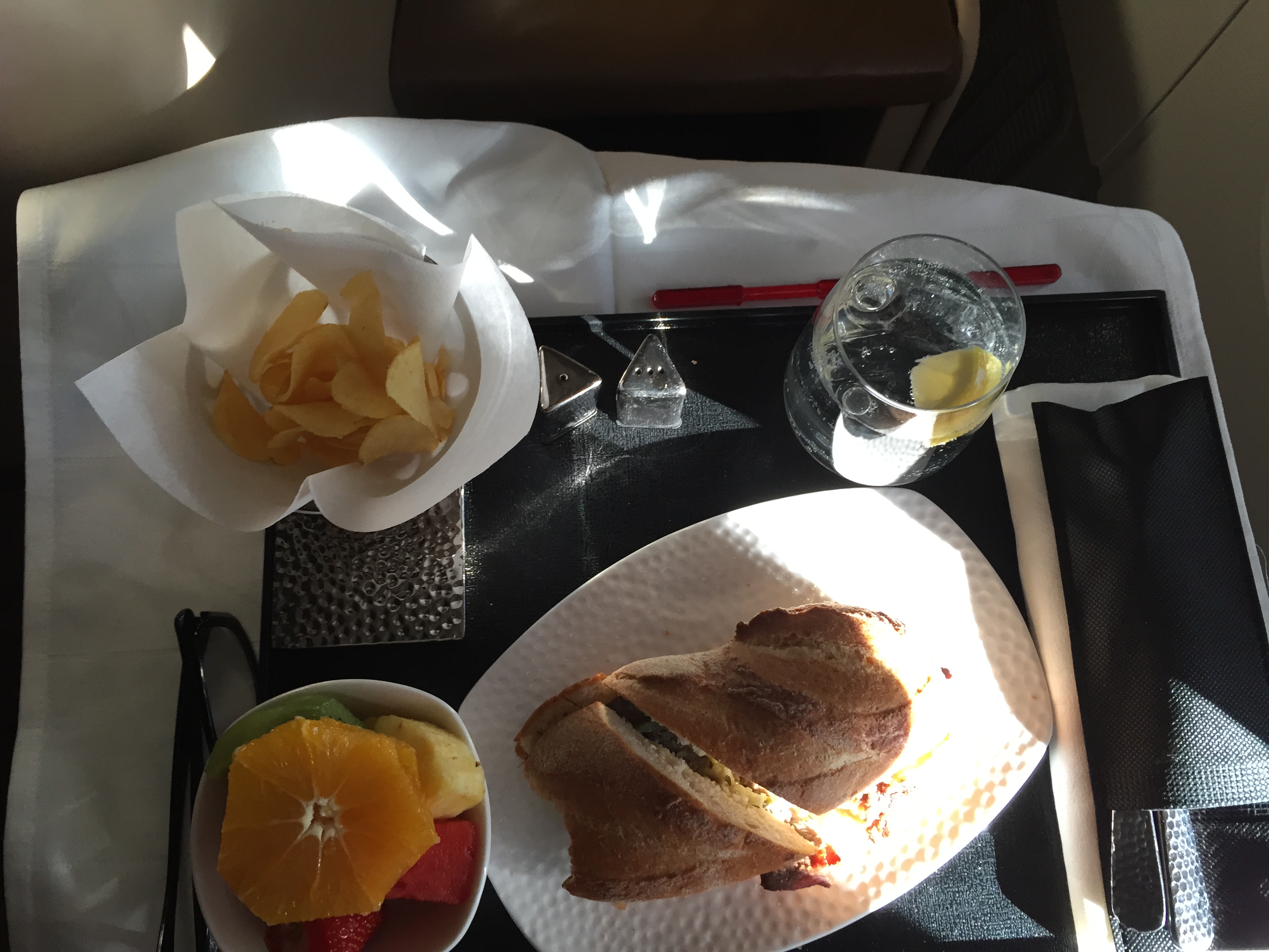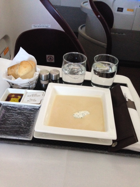 I opted for for a soup and a dessert right after take off. The food was delicious and very nicely presented. The crew was multi-cultural, polite and professional. They seemed to be in a good mood and available for a quick chat every now and then.