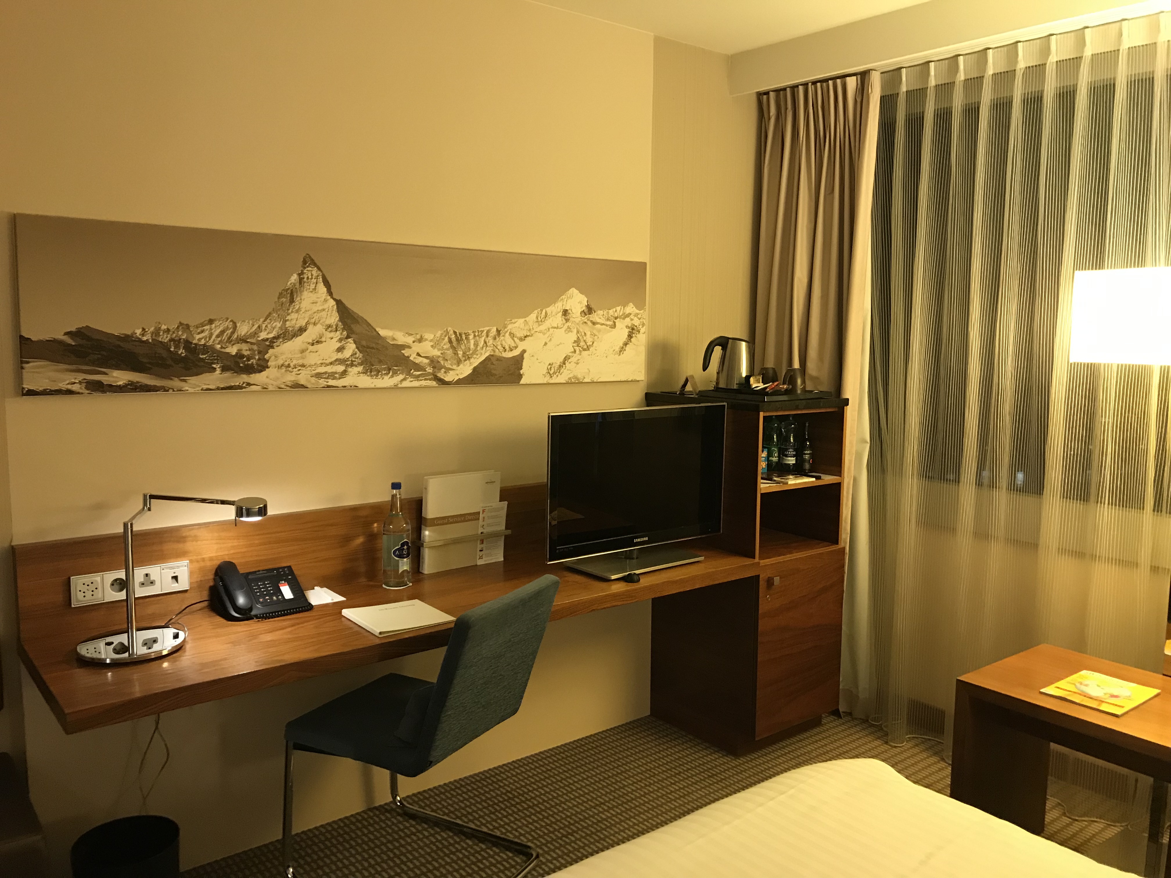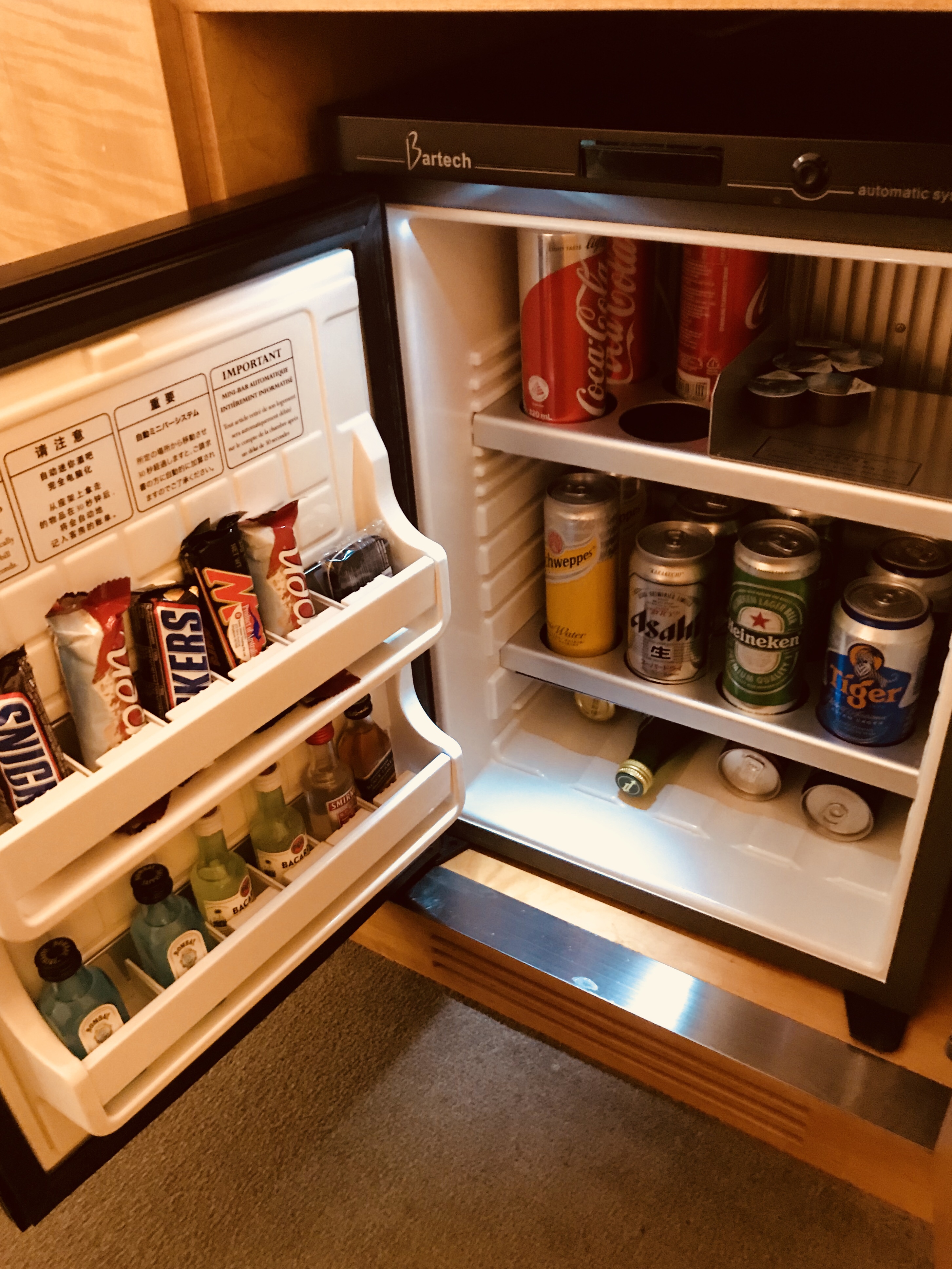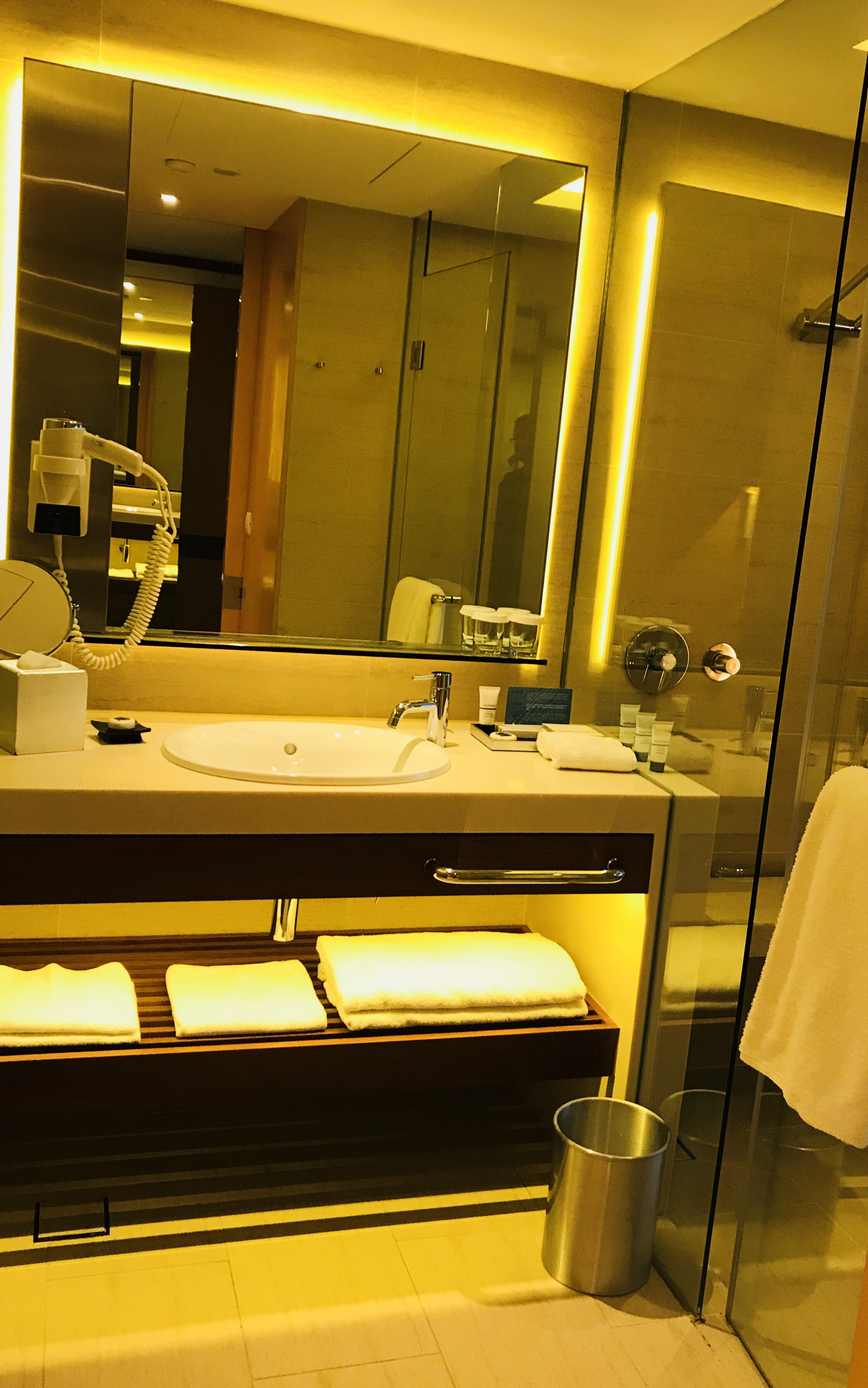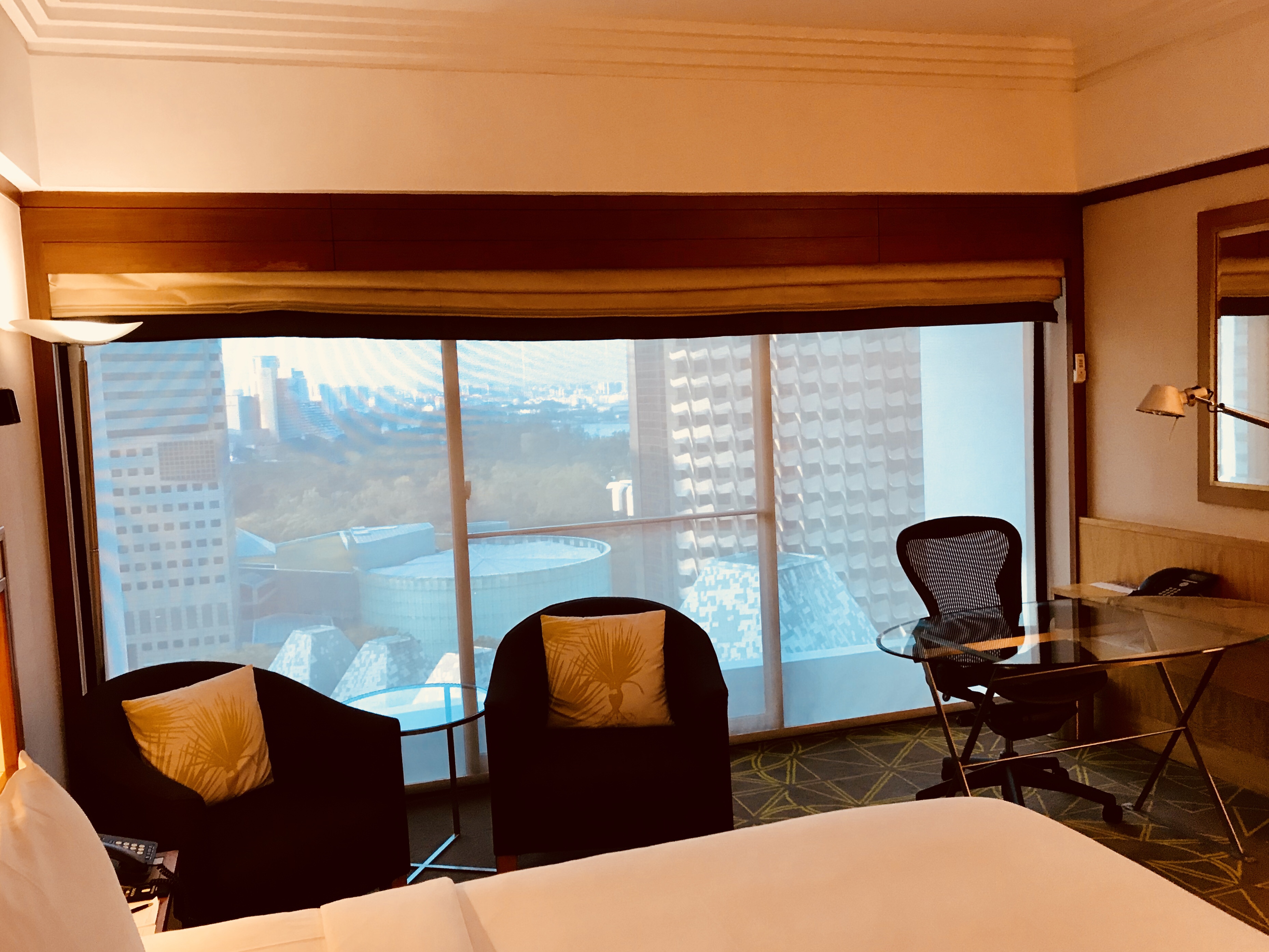 The rooms at the Pan Pacific are generously sized and are fitted out with modern decor. The bathrooms offer a large shower with electric shower curtains which can be closed to be totally separated from the bedroom. The large bed is very comfortable and the room offers plenty of electric outlets, a minibar and coffee/tea kettle. There is a day and a night curtain on the floor to ceiling window which can be operated fully automatically and offers complete darkness.