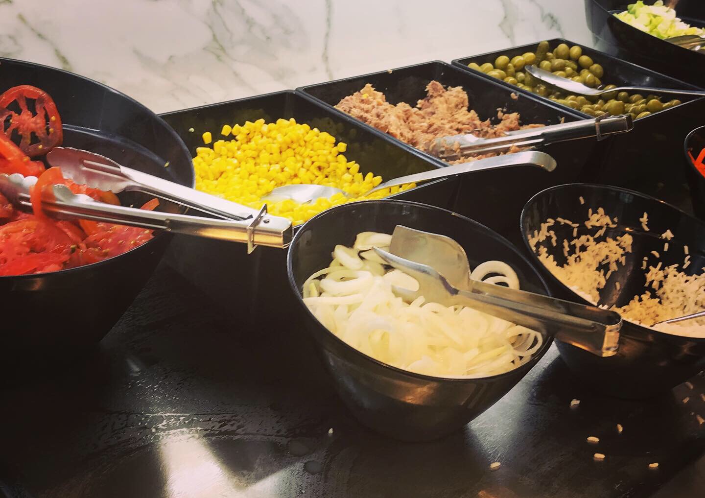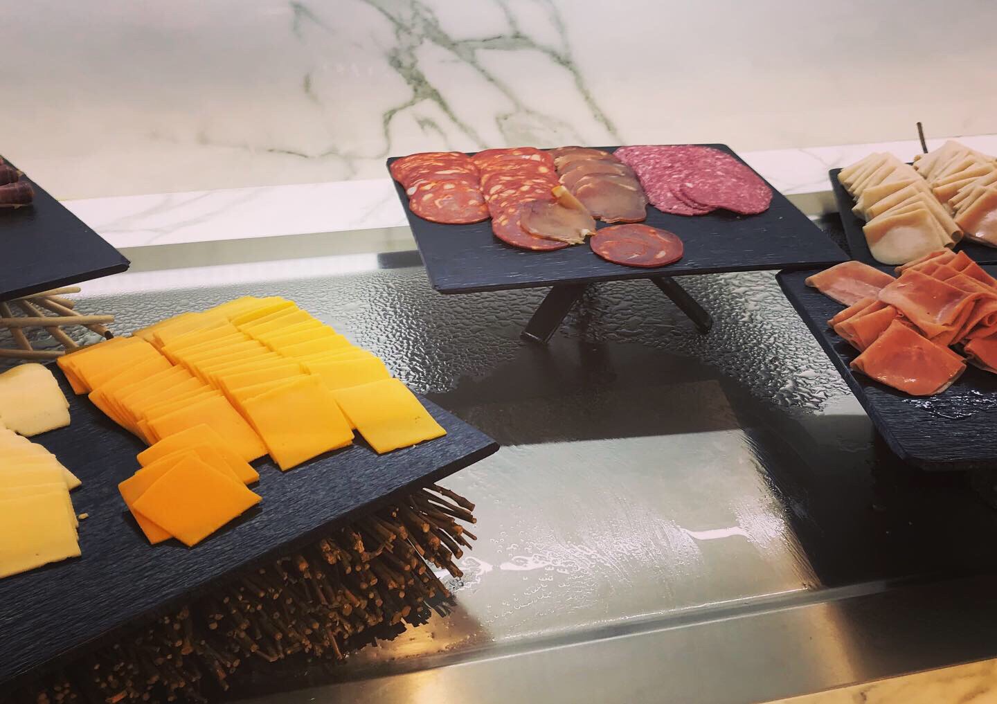 There is a large self-service area consisting of a full bar, a coffee bar and hot and cold food items. There are quiches, sausages, cold cuts, soups and salads as well as a pasta dishes. I tasted a few items and they were all fine.