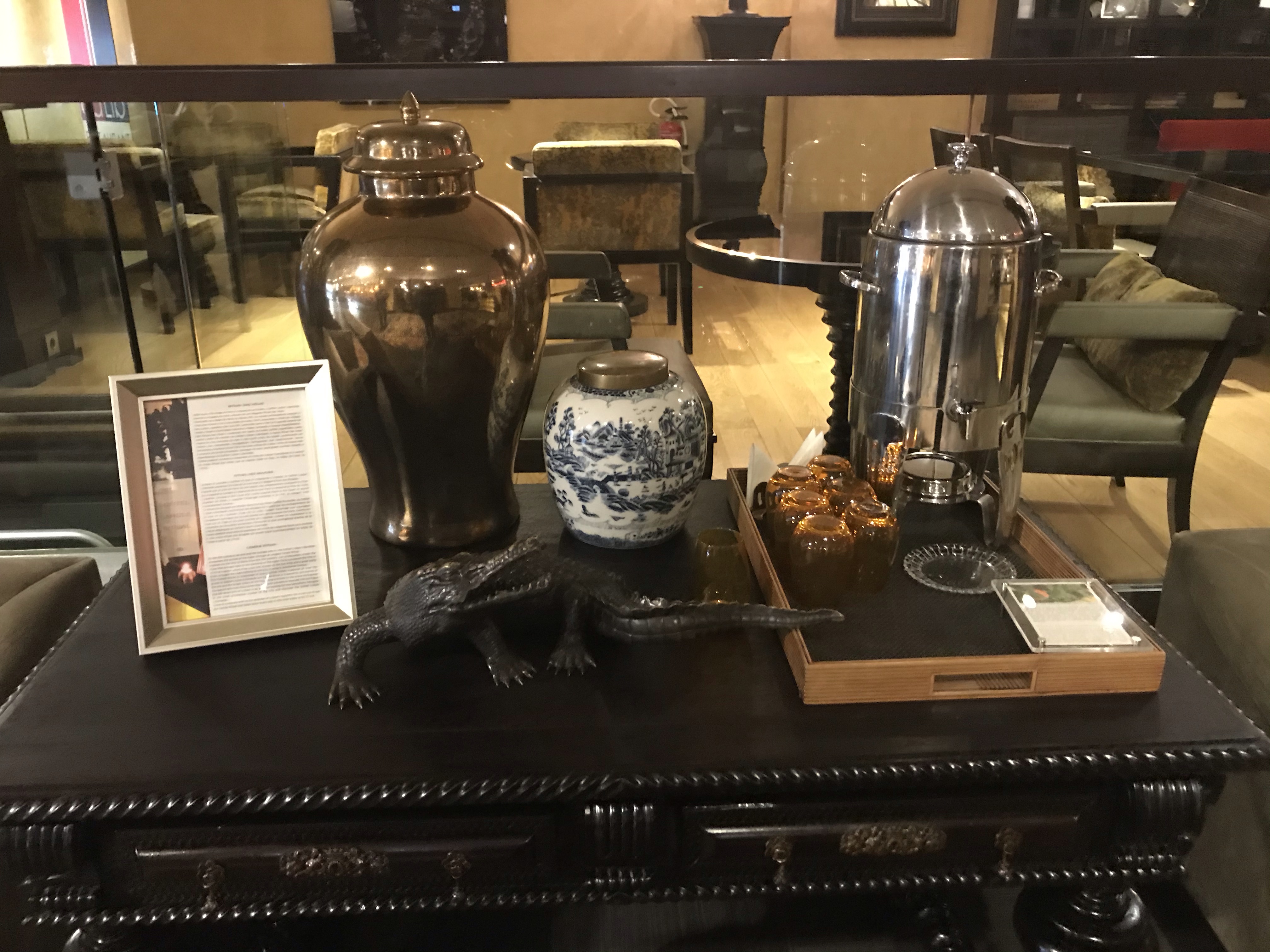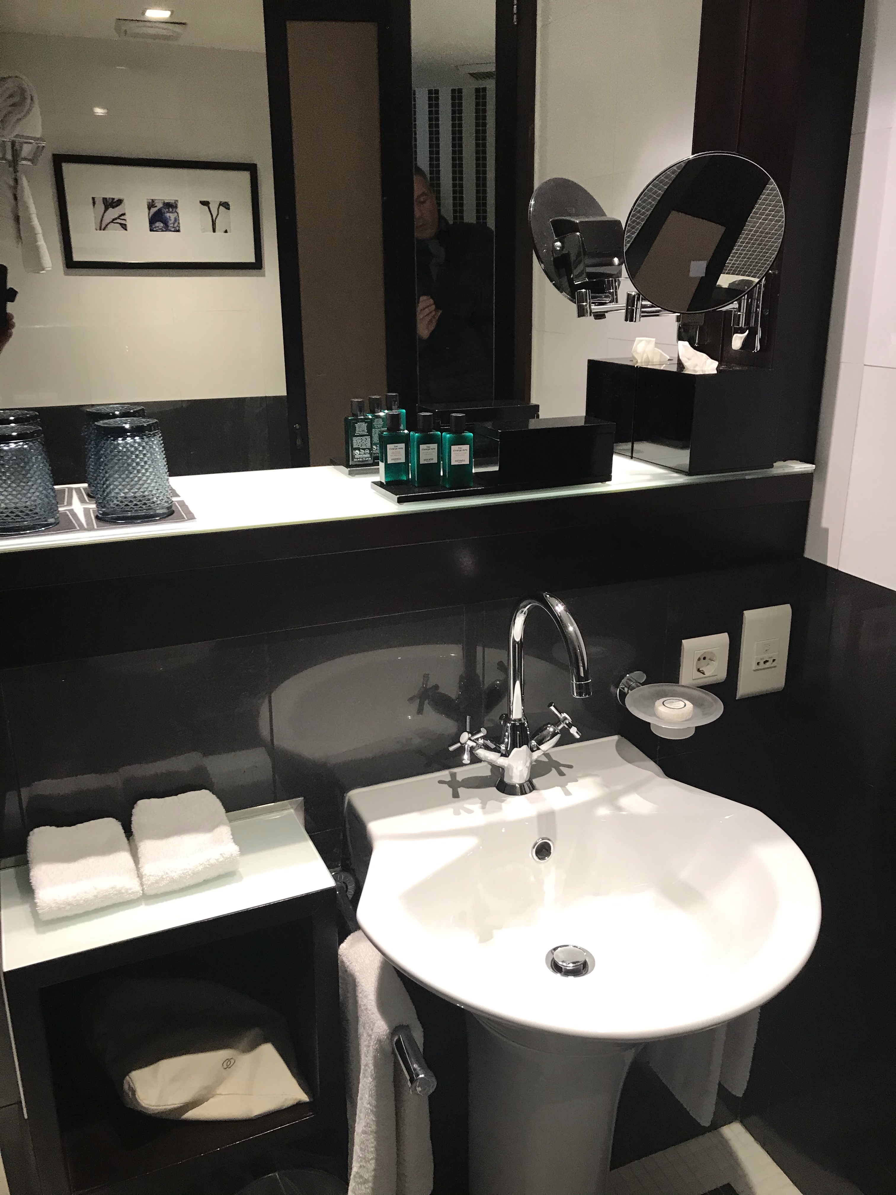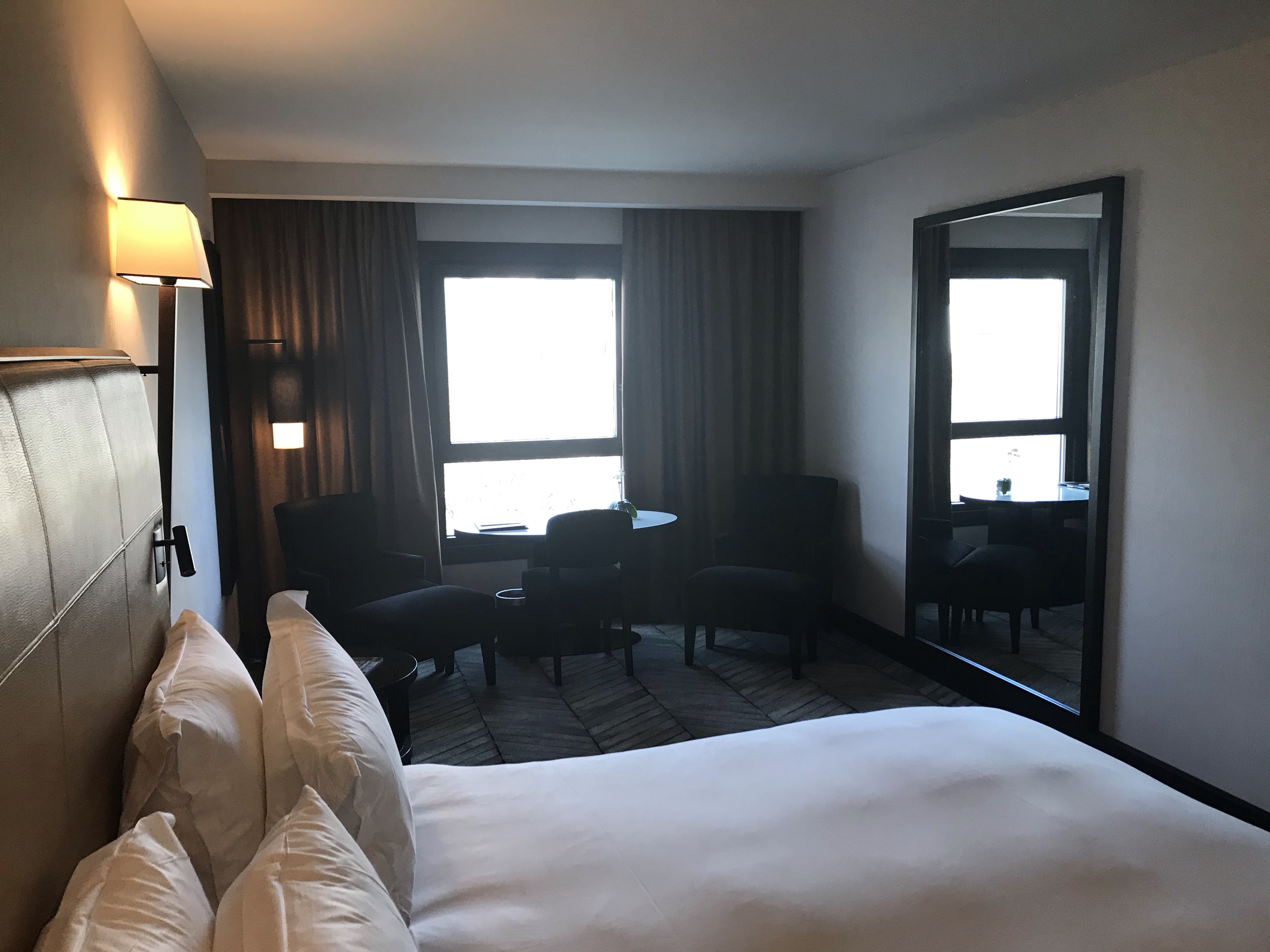 The room was spacious with a large, comfortable, soft bed where I slept very well and a rather small bathroom which featured French Hermès products. There was a minibar, a coffee maker and water kettle available. Turn-down service was also done and little chocolates left on the pillow before the night rest.