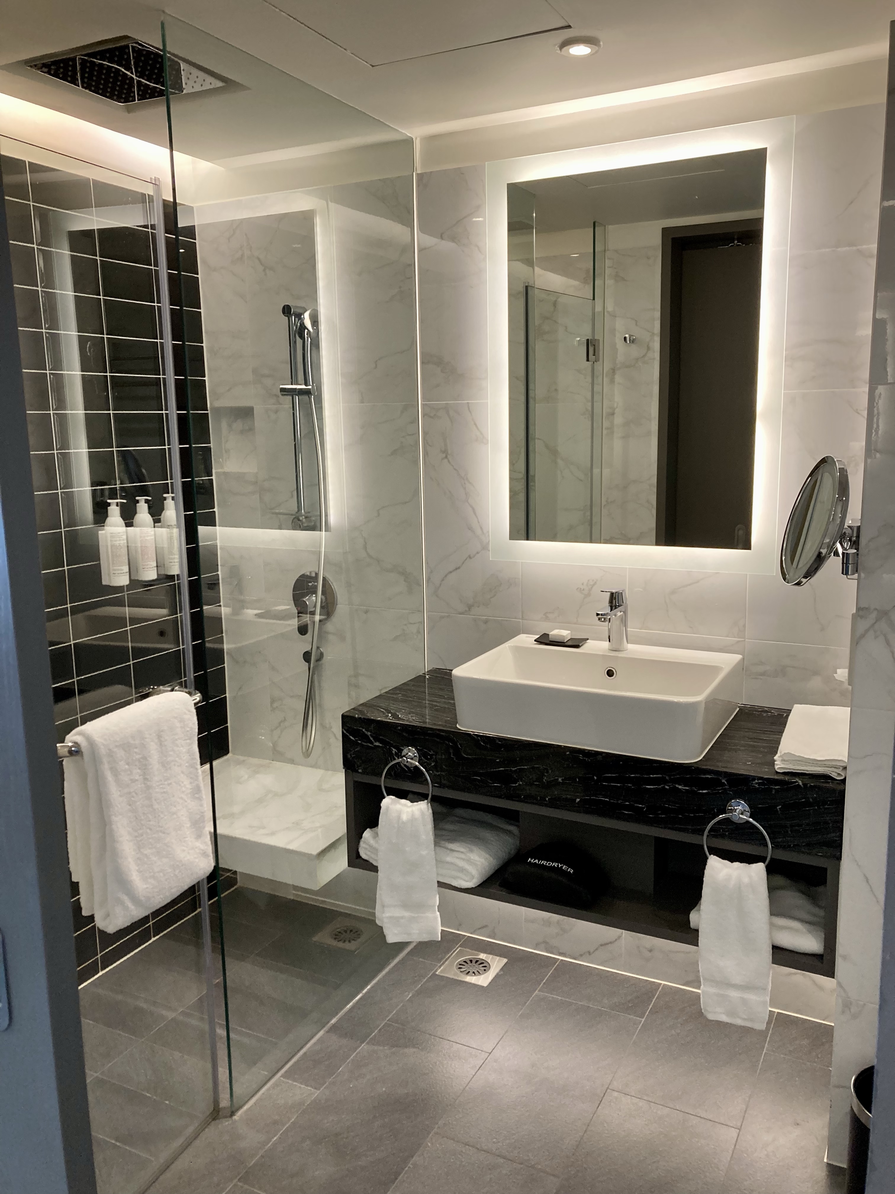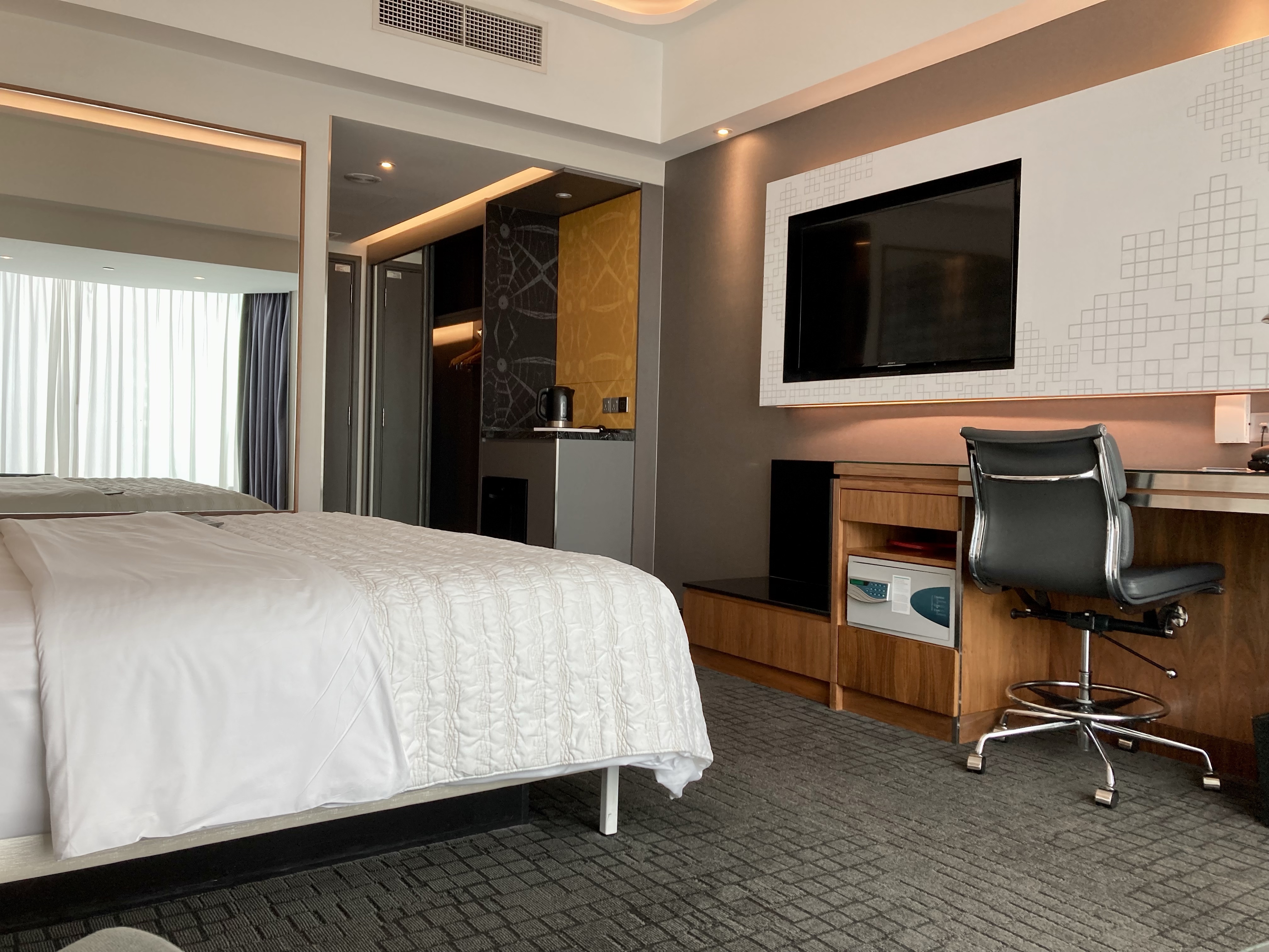 The room was located on the 27th floor with a nice view over the city and the KL Sentral station. A generous room size, a French press coffee maker, as well as a water boiler and a large empty fridge was available. The decor was minimal but functional with a very comfortable bed and plenty of pillows. Bathroom was nice with built in shower bench.