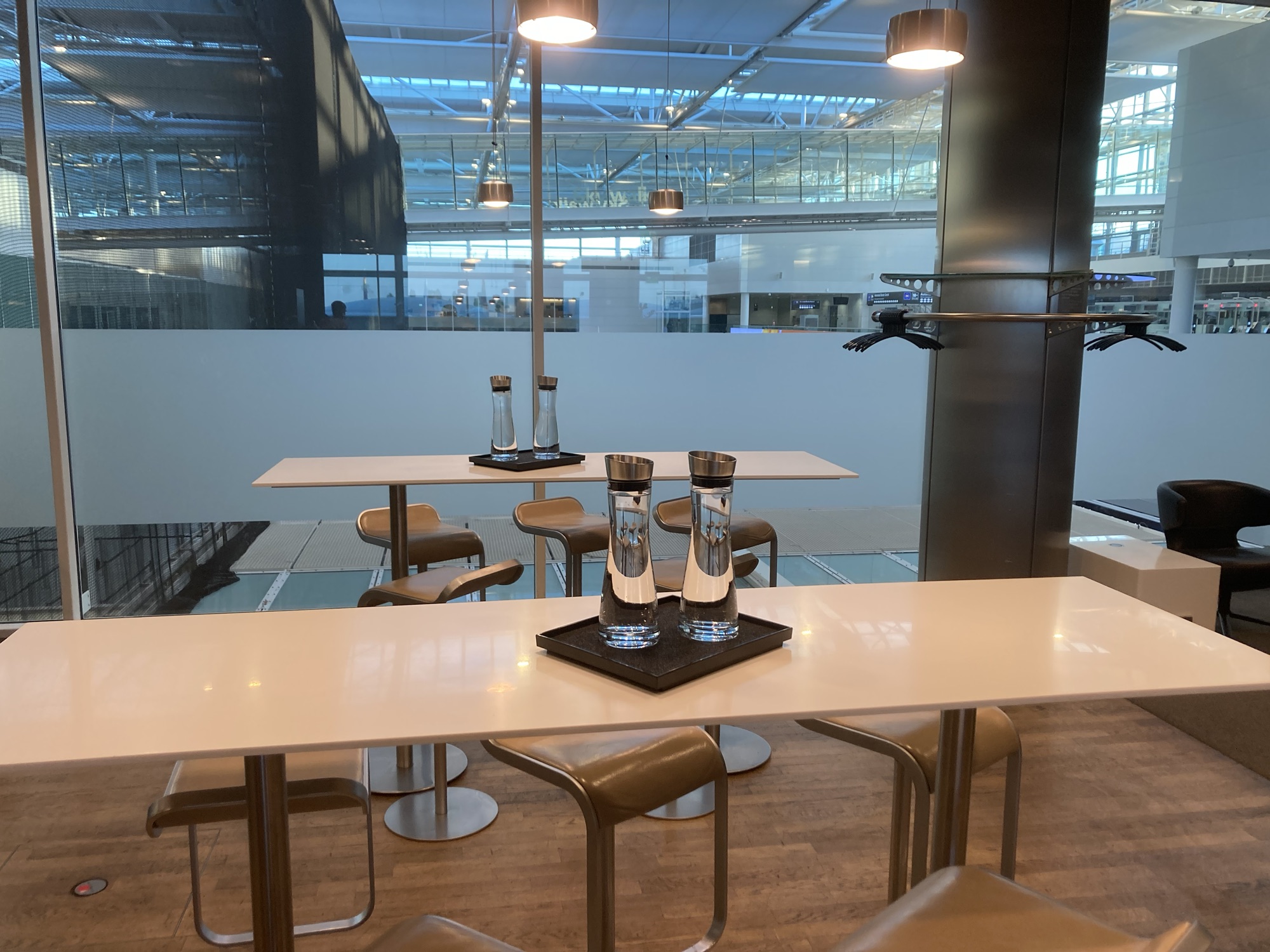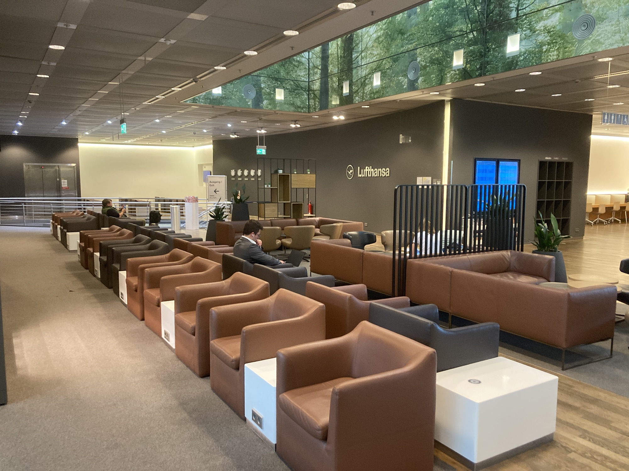 My visit to the Lufthansa Business Class Lounge in Munich Airport was an underwhelming experience and nothing to write home about. The lounge is located upstairs, above the security checkpoint and offers a partial view of the security check area). The lounge design is clean and simple, if not to say somewhat boring with no alpine or Bavarian design elements.
